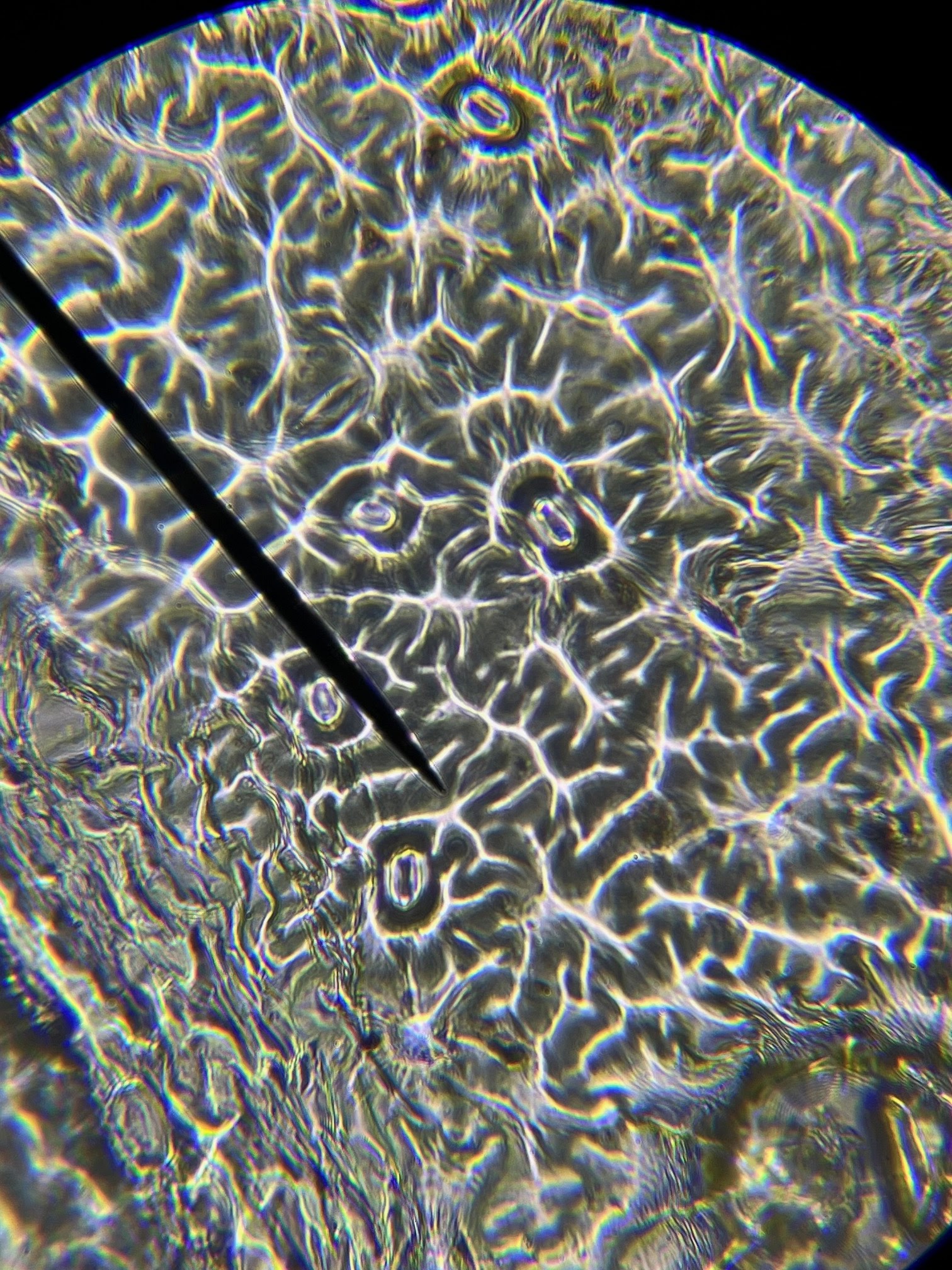 The leaf surface has the large oil glands and also a lots of conical pits which are also oil glands missing the oil which was held in a thin sack. There are also white structures which are too large to be stomata and appear to be some form of protrusion, maybe tiny hair like structures. All three species have these oil glands.